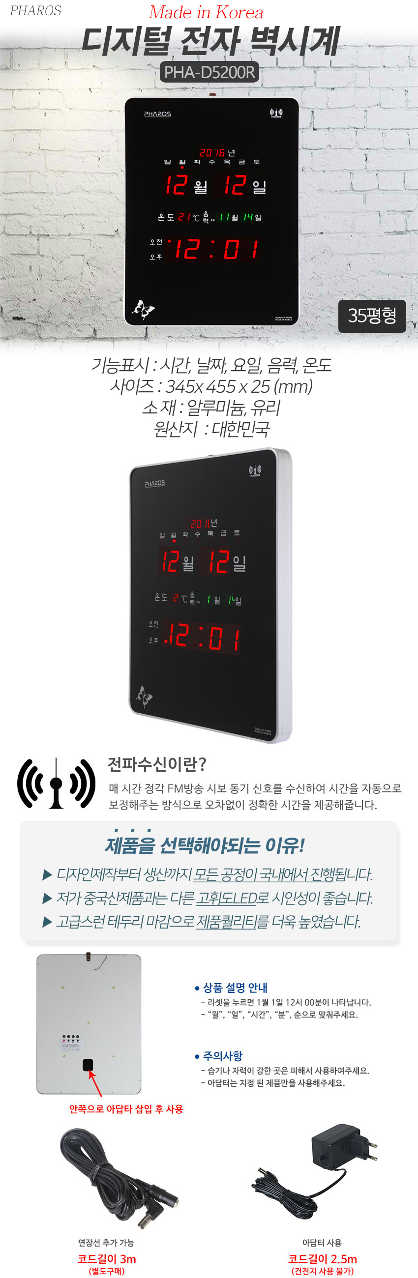 디지털 전자 벽시계 전파수신 LED 벽걸이시계 캘린더형 사무실 거실 개업선물 PHA-D5200R